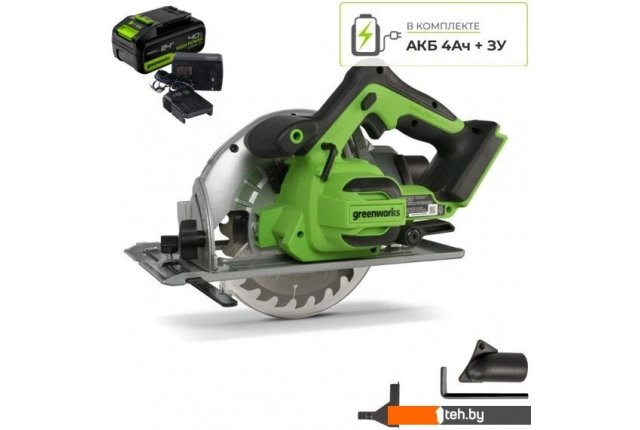 | Комплектация | - Циркулярная аккумуляторная пила Greenworks GD24CS (арт.1500907); - Аккумулятор Greenworks 24V, 4 А/ч; - Зарядное устройство Greenworks 24V, 2А; - Пильный диск 184х20 мм (24T); - Параллельный упор; - Съёмный патрубок для подключения пылесоса; - Шестигранный ключ; - Руководство по эксплуатации; - Гарантийный талон. |