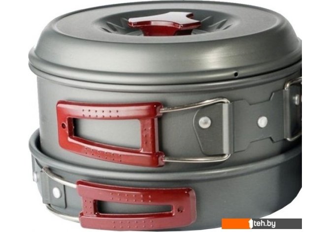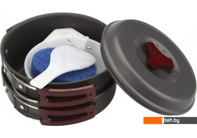 | Состав набора | - котелок 1,8 л с крышкой и складными ручками - котелок 1 л с крышкой и складными ручками - сковорода 154 мм со складными ручками - ложка суповая - складной половник - тарелки глубокие пластмассовые 2 шт - губка для мытья посуды |