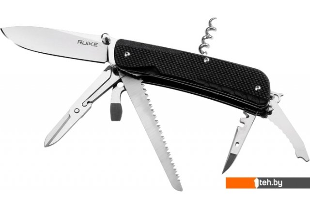 | Информация | Чтобы иметь возможность справиться с любой работой, которая может оказаться актуальной во время туристического похода или пикника на природе, лучше всего брать с собою многофункциональный нож. Например, модель Ruike LD42 может выполнять 19 различных операций благодаря целому комплекту встроенных инструментов. Этот нож легко заменяет целый ящик обыкновенных инструментов и при этом без проблем помещается в карман. Все инструменты, которые встроены в Ruike LD42, сделаны из шведской нержавеющей стали. Эта марка называется 12С27 и относится к числу мартенситных сплавов с закалкой при низких температурах. В отличие от большинства нержавеющих сплавов, эта сталь является очень твердой – до 59 HRC, что позволяет ножам отлично сохранять заточку. Размер лезвия составляет 85 мм. Клинок сделан прочным и надежности ему добавляет то, что толщина обуха составляет 3 мм. Такой нож легко выдерживает большие нагрузки. Чтобы работать с ним было не только легко, но и безопасно, в Ruike LD42 встроен один из самых надежных замков с линейной конструкцией – Liner lock. Он дает жесткую фиксацию и не дает лезвию складываться до тех пор, пока пользователь не сдвинет фиксатор вручную. Режущая кромка ножа заточена способом Plain, что подразумевает совершенно ровную режущую кромку. Нож – далеко не единственный инструмент в модели Ruike LD42. Помимо него имеется мини версия пилы по дереву, ножницы, инструмент для разрезания ремней, остро заточенное шило, инструменты, которыми можно легко зачистить от изоляции провода, две прямые отвертки, штопор и открывалка для бутылки. Кроме того, в торце ручки имеется небольшой стеклобой. Также производители предусмотрели сразу две альтернативные возможности страховки ножа во время его транспортировки. Во-первых, для этого есть стальное кольцо, которое находится рядом со стеклобоем. К этому кольцу можно привязать темляк или же прикрепить цепочку, которую затем зафиксировать. Во-вторых, на рукоятке прикручена стальная клипса, которая позволяет зафиксировать нож в кармане или даже на поясном ремне. Ручка ножа покрашена в черный цвет. Она сделана из G10 – известной модификации стеклопластика, который является композитным материалом. |