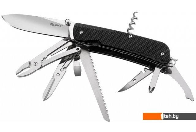 | Информация | Модель Ruike LD51 объединила максимальное для своей серии количество инструментов. Как и сам нож, они размещены в нутрии одной общей рукоятки. Таким образом, все инструменты постоянно находятся под рукой и Ruike LD51 сможет выручить своего владельца практически в любой ситуации. Это нож особенно хорошо подходит туристам и рыбакам, которым срочный ремонт того или иного снаряжения может понадобиться прямо на природе. Наиболее важным инструментом в Ruike LD51 является именно нож. Он сделан удобным для выполнения большинства видов работ, подходит для обычных разрезов и колющих надрезов. Размер клинка в длину составляет 85 мм, а запас прочности создается за счет толщины обуха 3 мм. Чтобы сделать это лезвие универсальным, производители гладко его заточили (согласно технике plain). Кроме того, нож очень тщательно отшлифован. Открыть клинок не составит труда даже одной рукой, для чего нужно использовать закрепленный на нем шпенек. А чтобы работать под нагрузкой было как можно более безопасно, в нож установлен один из лучших замков – Liner lock. Он нужен, чтобы фиксировать лезвие в его крайнем положении, то есть – открытым. Таким образом, нож не сможет сложиться под нагрузкой. Модель Ruike LD51 получила весь набор инструментов, возможных для этой серии, поэтому будет полезна для выполнения практически любого ремонта, а также в целом ряде других ситуаций. Рядом с ножом размещаются маленькие плоскогубцы, уменьшенная версия ножниц, пила по дереву, а также открывалка для бутылок, отвертка с прямым шлицем шириною 6,5 мм и приспособления для зачистки проводов. С противоположной стороны рукоятки ножа открываются шило с возможностью продеть в него нитку и еще парой приспособлений для снятия изоляции, крестовая отвертка небольшого размера, прямая отвертка шириною 3 мм, резак для ремней. С этой же стороны, но уже в самом торце ручки размещается стеклобой, кольцо, которому можно подвесить цепочку или любой темляк. Кроме того, из корпуса полностью достаются щипцы, которые, тем не менее, плотно сидят внутри рукоятки и не выпадают из нее. Но верхней части рукоятки расположен штопор. Ну а на одной из широких сторон прикручена прижимная клипса. Все перечисленные инструменты отличаются высокой прочностью, те, которых это касается, качественно заточены. Они сделаны из нержавейки (сталь 12С27) и почти не нуждаются в уходе. Рукоятка же изготовлена из стеклопластика. Это композитный материал, а потому он отличается повышенной прочностью. Модель Ruike LD51 весит 262 грамма и запросто помещается в любом кармане. |