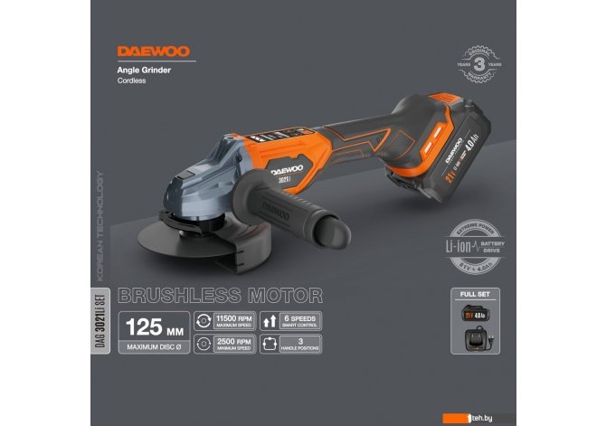 Если хотите купить болгарка Daewoo Power DAG 3021Li Set (с 1-им АКБ) то следует уточнить все параметры и габариты модели перед покупкой. Представленые характеристики на сайте 1teh.by могут отличаться от действительных или указанных производителем. Описание, фото товара и технические характеристики представлены для справки.
