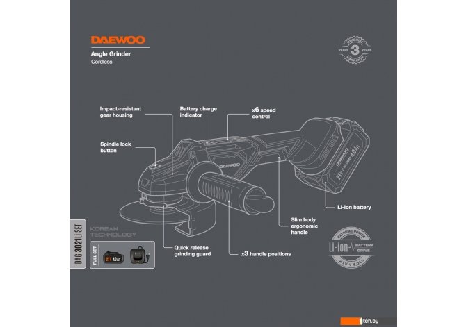 Фотографии, описание и технические характеристики модели болгарки Daewoo Power DAG 3021Li Set (с 1-им АКБ) взяты из открытых источников, официального сайта производителя или представительства Daewoo Power в Республике Беларусь.
