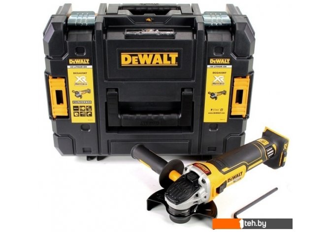 Фотографии, описание и технические характеристики модели болгарки DeWalt DCG405NT (без АКБ, кейс) взяты из открытых источников, официального сайта производителя или представительства DeWalt в Республике Беларусь.