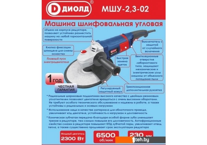Фотографии, описание и технические характеристики модели болгарки ДИОЛД МШУ-2.3-02 взяты из открытых источников, официального сайта производителя или представительства ДИОЛД в Республике Беларусь.