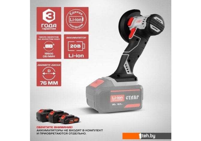 Если хотите купить болгарка Ставр МШУА-76/20 (без АКБ) то следует уточнить все параметры и габариты модели перед покупкой. Представленые характеристики на сайте 1teh.by могут отличаться от действительных или указанных производителем. Описание, фото товара и технические характеристики представлены для справки.