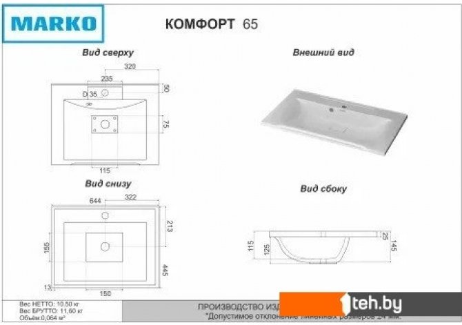 Если хотите купить умывальник Marko Комфорт 65 то следует уточнить все параметры и габариты модели перед покупкой. Представленые характеристики на сайте 1teh.by могут отличаться от действительных или указанных производителем. Описание, фото товара и технические характеристики представлены для справки.