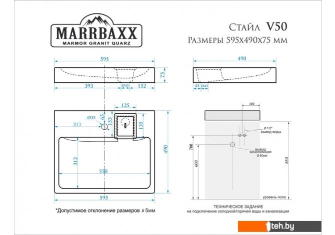 | Информация | ? Умывальник MARRBAXX Стайл V50 (белый D1) из литьевого мрамора. ? В комплекте с кронштейном для установки. ?? Без сифона. ?? Не рекомендуется устанавливать на столешницу стиральной машины. |