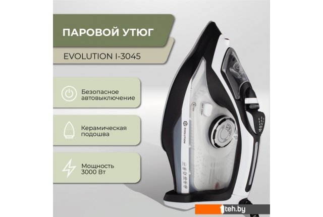 Фотографии, описание и технические характеристики модели утюга Evolution I-3045 взяты из открытых источников, официального сайта производителя или представительства Evolution в Республике Беларусь.