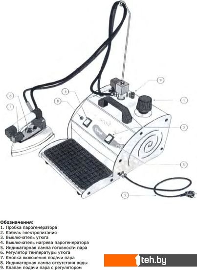 Информация | Парогенератор в комплекте с профессиональным электропаровым утюгом. Индикаторные лампы работы прибора: утюг включен, бойлер включен, пар готов, нет воды в бойлере. Комплектация: термоковрик, спица поддерживающая провода. |