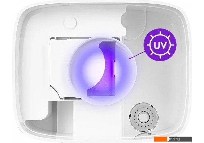 - Увлажнитель также оснащён ультрафиолетовой лампой, которая эффективно обеззараживает воду, уничтожая бактерии и вирусы.