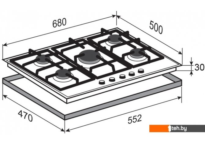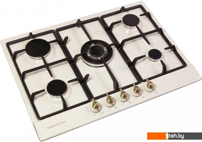 | Подробная информация о конфорках | Мощность горелок, Вт 3400; 2400; 1880; 1880; 900 |