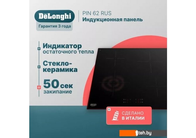 Фотографии, описание и технические характеристики модели варочной панели DeLonghi PIN 62 RUS взяты из открытых источников, официального сайта производителя или представительства DeLonghi в Республике Беларусь.