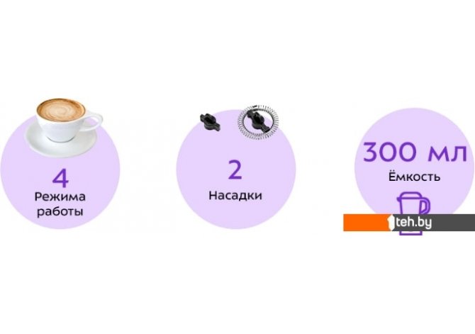 | Режимы приготовления | вспенивание холодного молока, вспенивание горячего молока, подогрев молока (смешивание с подогревом и без) |