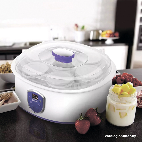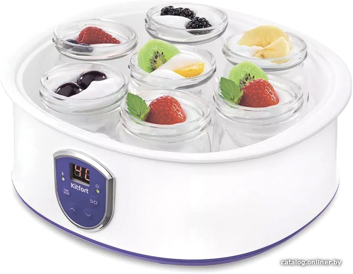 Информация | Домашний и полезный йогурт у вас дома Йогуртница Kitfort КТ-2088 с электронным управлением предназначена для приготовления вкусного и полезного домашнего йогурта. Йогуртница равномерно нагревает баночки с ингредиентами, поддерживая заданную температуру. Регулировка времени и температуры приготовления Йогуртница имеет панель управления для установки времени и температуры приготовления и светодиодный дисплей для отображения настроек. Об окончании приготовления йогурта вас известит звуковой сигнал. Стильный дизайн впишется в любой интерьер Прибор имеет приятный дизайн. Несмотря на хорошую вместимость, йогуртница имеет небольшие габариты, что позволяет ей удачно вписаться в интерьер любой кухни, не заняв при этом много пространства. Корпус изготовлен из пластика. Дай волю фантазии! Приготовление домашнего йогурта очень увлекательный процесс, который позволит дать волю фантазии в выборе наполнителей на любой вкус! Однозначно понравится взрослым, детям и тем, кто следит за своей фигурой! Польза и безопасность В комплекте идут 7 стеклянных баночек по 180 мл, в которых готовый йогурт можно хранить в холодильнике. Стеклянные баночки сохраняют натуральные свойства домашнего йогурта, а также являются экологически чистым материалом. |