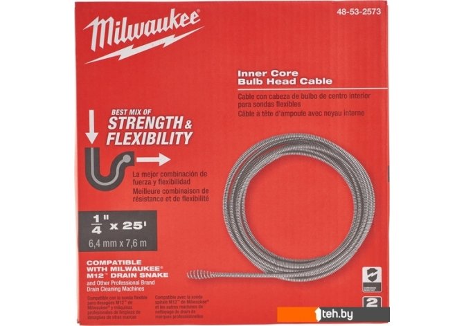 Информация | ? Тросик Milwaukee 48532573 с грушевидным наконечником и сердечником, диаметром 6мм и длиной 7,6м ? Подходит для труб диаметром до 50мм |