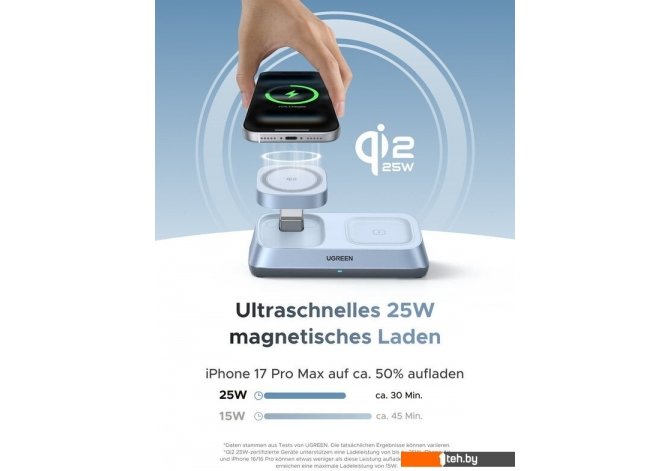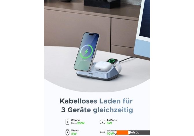 | Информация | -Ключевые характеристики Многофункциональная беспроводная зарядная станция рассчитана на одновременную подзарядку до трёх устройств:смартфона, наушников и умных часов. Поддерживает магнитную фиксацию и обеспечивает мощность беспроводной зарядки до 25 Вт, что позволяет быстро восполнить заряд, а также имеет официальную сертификацию для Apple Watch Series 10. -Преимущества и отличия Благодаря Qi2-сертификации устройство обеспечивает ускоренную беспроводную зарядку совместимых смартфонов, а наличие 16 сильных магнитов гарантирует устойчивое положение гаджетов под любым углом. Встроенный механизм позволяет легко убирать площадку для зарядки часов внутрь корпуса одним нажатием. -Практичность Станция оснащена USB Type-C разъёмом для универсального подключения и комплектуется кабелем длиной 1 метр. Корпус выполнен из прочного пластика, а технология защиты NTC предотвращает перегрев, автоматически отключая зарядку при температуре 70-80 градусов. -Уникальность Модель отличается поддержкой сразу трёх популярных стандартов быстрой зарядки, включая Power Delivery и Qualcomm Quick Charge 3.0, а также полностью совместима с новейшими iPhone и Pixel. Инновационный механизм трансформации обеспечивает компактное хранение зарядной площадки для часов, не занимая лишнего пространства на рабочем столе. Читать дальше |