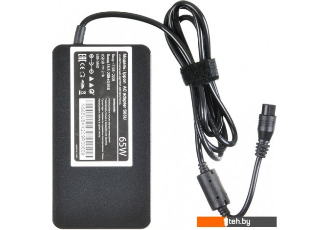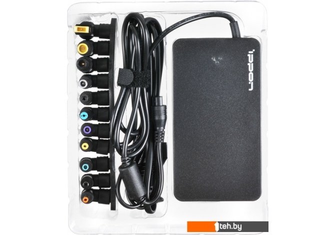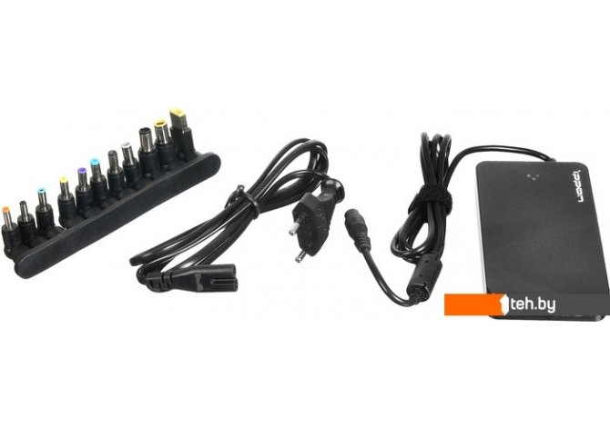 | Информация | Устройство представляет собой универсальный импульсный адаптер питания для ноутбуков с максимальной выходной мощностью 65Вт. Выходное напряжение постоянного тока на выходе адаптера питания может принимать одно из следующих значений: 15В, 16В, 18,5В, 19В, 19,5В. Выбор выходного напряжения осуществляется с помощью подсоединения одного из 8-и выходных разъемов, входящих в комплект поставки. Штекеры разъемов также отличаются размерами, благодаря этому достигается совместимость с большим количеством современных моделей мобильных компьютеров: |