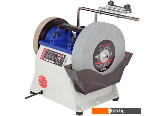 | Комплект поставки | Станок заточной c полировальным диском в сборе Диск заточной Поддон для воды Штанга направляющая Приспособление зажимное Приспособление для выставления углов Винт-барашек Паста полировальная Ключ гаечный Руководство по эксплуатации Упаковка |